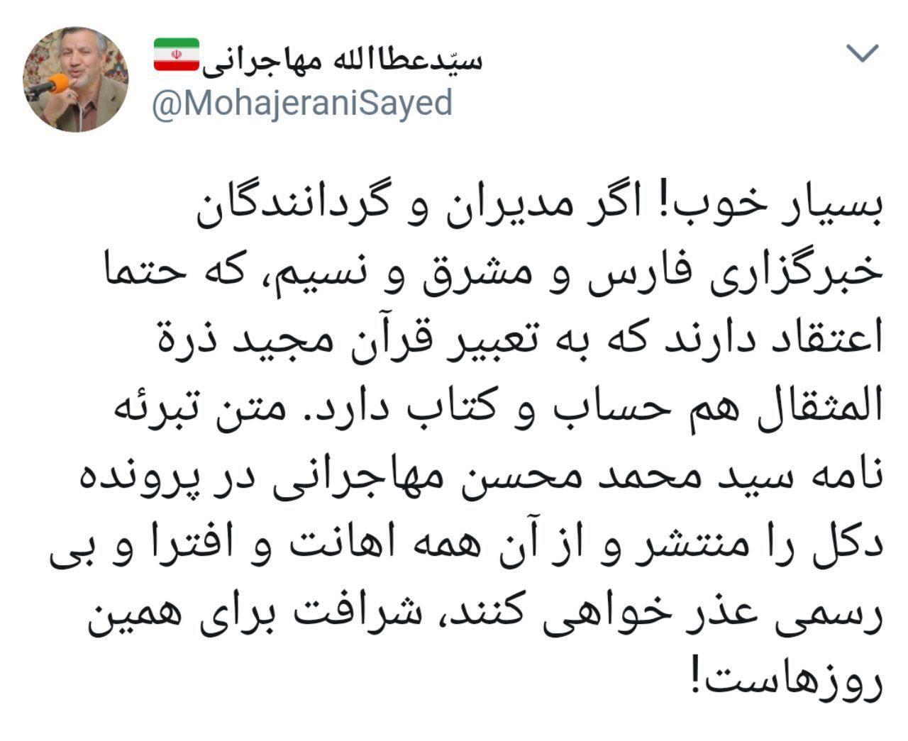 رویداد۲۴ عطاءالله مهاجرانی در صفحه شخصی توئیتر خود از تبرئه فرزندش در پرونده دکلهای نفتی خبر داد. او در متن توئیت خود از رسانهها فارس و مشرق و نسیم خواسته بخاطر اتهاماتی که به فرزندش زدهاند، عذرخواهی کنند.