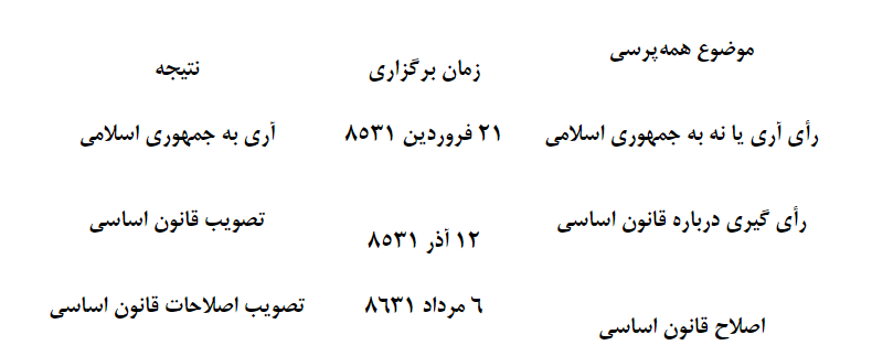 پس از پيروزي انقلاب اسلامي همهپرسي درايران طي سه مرحله تجربه شد.نخستین همهپرسي ایران پس از پیروزی انقلاب اسلامی، در روزهای دهم و یازدهم فروردین 1358 اتفاق افتاد. در این همهپرسی عمومی، نوع نظام حکومتی ایران با 98.2 درصد آرا،«جمهوری اسلامی»تعیین شد.