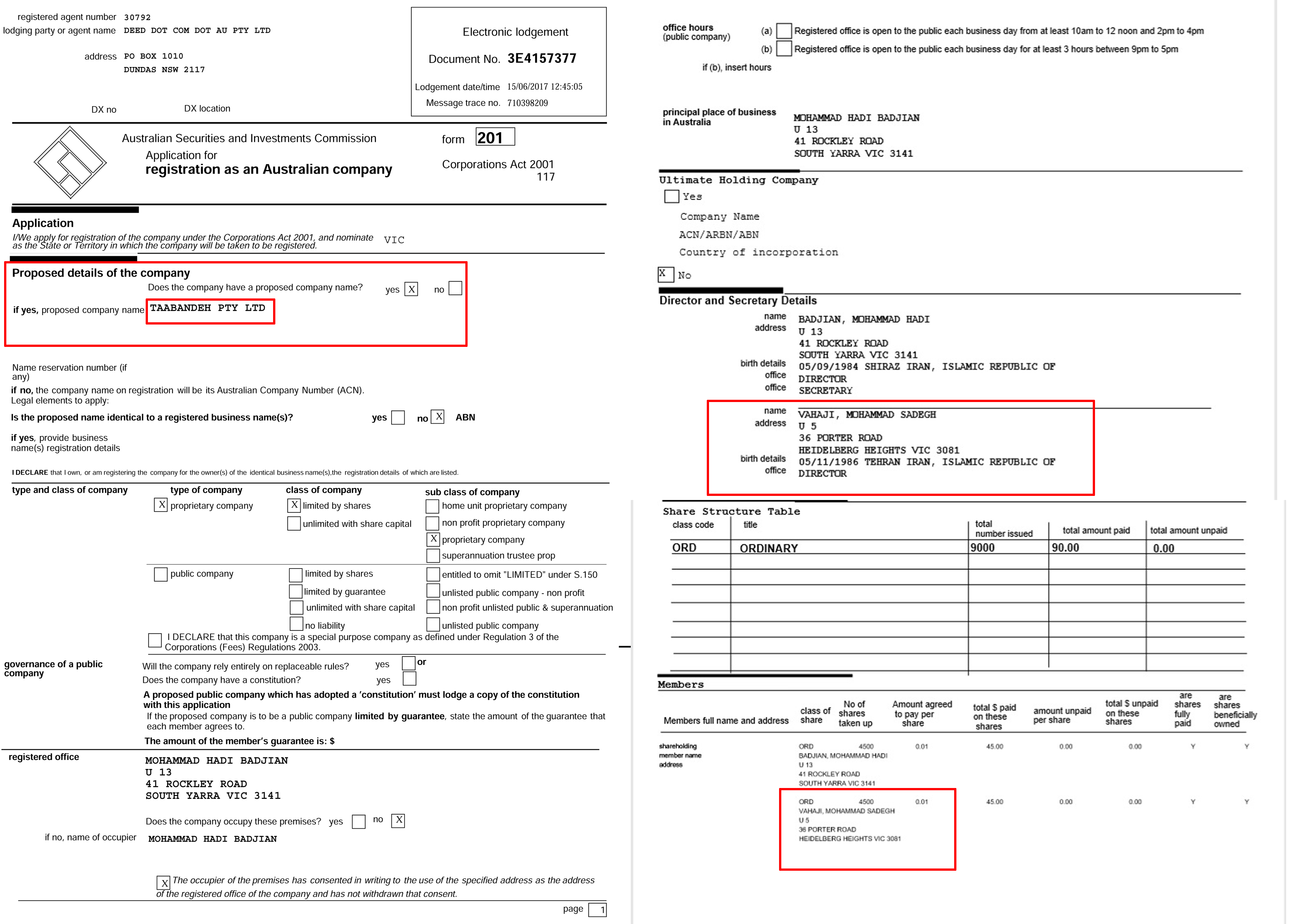 مدارک ثبت شرکت «تابنده» توسط محمد صادق وهاجی، پسر عبدالحسین وهاجی سفیر ایران در استرالیا