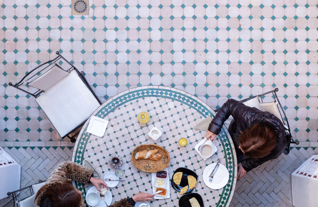 کشور مراکش به خاطر «زلیج»هایش شهرت دارد. زلیج نوعی کاشی کاری مرسوم و دست ساز در این کشور است که با ترکیبی از اشکال هندسی و رنگ های مختلف به دست می آید. در این عکس که در شهر مراکش (پایتخت این کشور) به ثبت رسیده نیز شما میتوانید زلیج های مراکشی را بر روی میز و کف زمین ببینید.