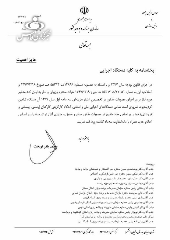 محمدباقر نوبخت در بخشنامهای به تمامی دستگاههای اجرایی اعلام کرد: تمامی دستگاههای اجرایی ملی و استانی باید احکام کارگزینی کارکنان رسمی، پیمانی و قراردادی خود را بر اساس مفاد مندرج در مصوبات صادر و حقوق و مزایای آنان در تیرماه را بر اساس احکام جدید همراه با مابهالتفاوت سه ماه گذشته پرداخت کنند.