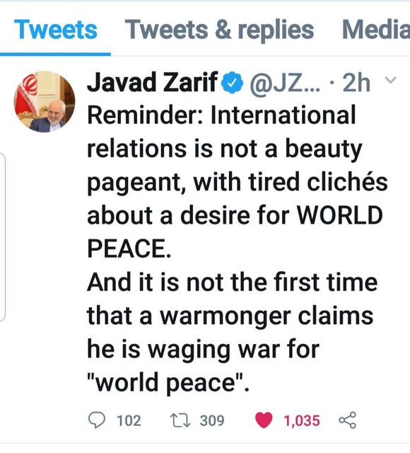 او همچنین در ادامه این توییت با ذکر عبارت «یادآوری» نوشت: روابط بینالملل مسابقه ملکه زیبایی با کلیشههای خستهکننده درباره تمایل به صلح جهانی نیست و اولین بار هم نیست که یک جنگطلب ادعا میکند که برای «صلح جهانی» جنگ راه میاندازد.