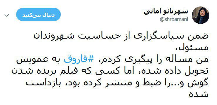 رویداد۲۴ شهربانو امانی عضو شورای شهر در توییتر خود نوشت: ضمن سپاسگذاری از حساسیت شهروندان مسئول، من مسئله را پیگیری کردم، #فاروق به عمویش تحویل داده شده، اما کسی که فیلم بریده شدن گوش را ضبط و منشتر کرده بود، بازداشت شد.
