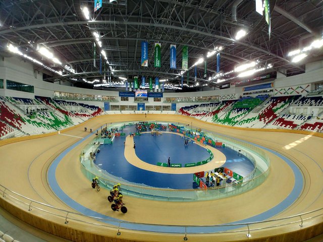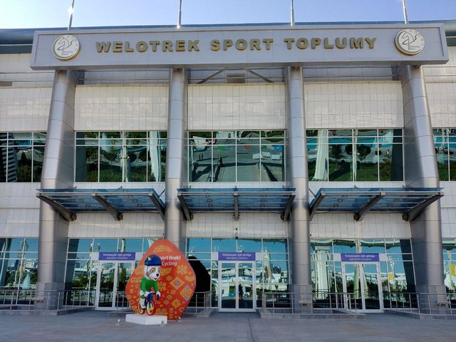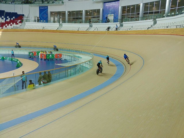 ترکمنستان در توصیف پیست دوچرخه‌سواری‌اش می‌گوید، "مجموعه المپیک عشق آباد مانند یک تاج است که پیست دوچرخه‌سواری یکی از جواهرات این تاج محسوب می‌شود.  این پیست از بهترین مواد که از فنلاند آمده، ساخته شده و در سال ۲۰۱۴ هم کامل شد، ظرفیت شش هزار نفری دارد و رقابت‌های مهمی را در آینده و در سطح جهانی میزبانی خواهد کرد."