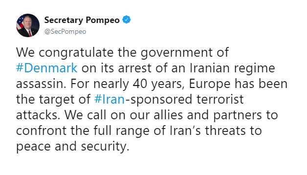 مایک پومپئو در واکنش به این خبر در توییتر خود نوشت: به دولت دانمارک بابت دستگیری یک ایرانی قاتل تبریک میگوییم. ما از شرکا و متحدانمان میخواهیم که با تهدیدهای مختلف ایران علیه صلح و امنیت مقابله کنند. نزدیک چهل سال است که اروپا هدف اقدامات تروریستی ایران است.