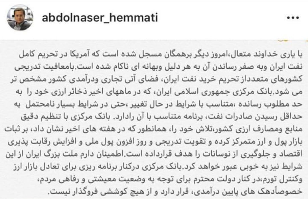 همتی در توییت خود نوشت: با یاری خداوند متعال، امروز دیگر بر همگان مسجل شده است که آمریکا در تحریم کامل نفت ایران و به صفر رساندن آن به هر دلیل و بهانهای ناکام شده است.