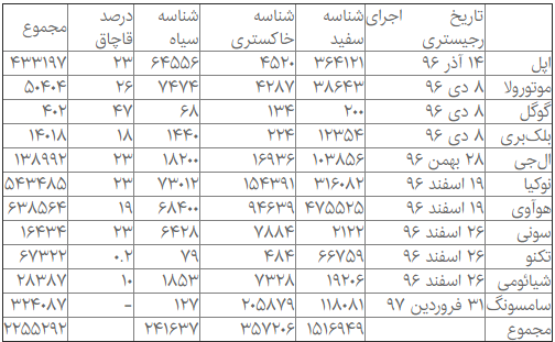 بر اساس این فهرست، تا پایان خرداد ۹۷، از میان حدود دو میلیون و ۲۲۵ هزار گوشی تلفن همراه رجیستر شدهاند که بیشترین آمار به برندهای هوآوی، نوکیا، اپل و سامسونگ تعلق داشته است. البته باید در نظر داشت که با پیوستن سامسونگ از ابتدای اردیبهشت ۹۷ به این طرح و رجیستر شدن ۳۲۴ هزار در طول دو ماه نمیتوان انتظار داشت که این آمار به مرور شامل تغییرات اساسی شده باشد. تا خرداد ۹۷، همچنین بیشترین تعداد گوشیهای قاچاق یا گوشیهایی که بعد از مدت یک ماهه مقرر نسبت به رجیستری اقدام نکردهاند، به ترتیب به سه برند اپل، نوکیا و هوآوی تعلق دارد.