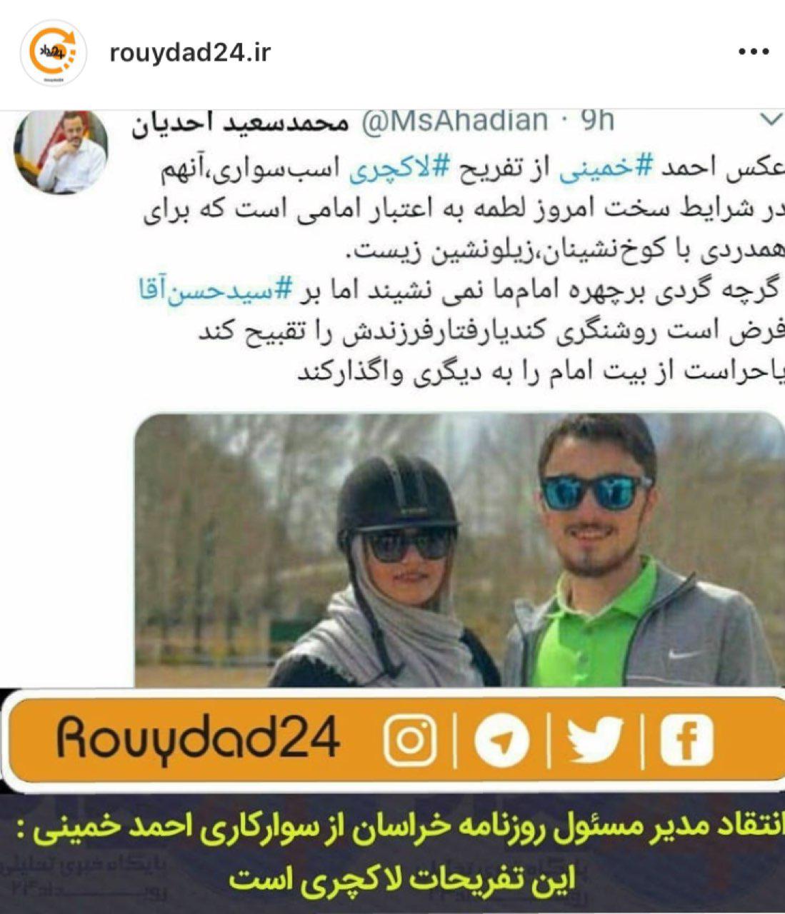 رویداد۲۴احدیان مدیرمسئول روزنامه خرسان در صفحه شخصی اینستاگرام خود انتقاداتی را متوجه نوه امام خمینی کرده است.