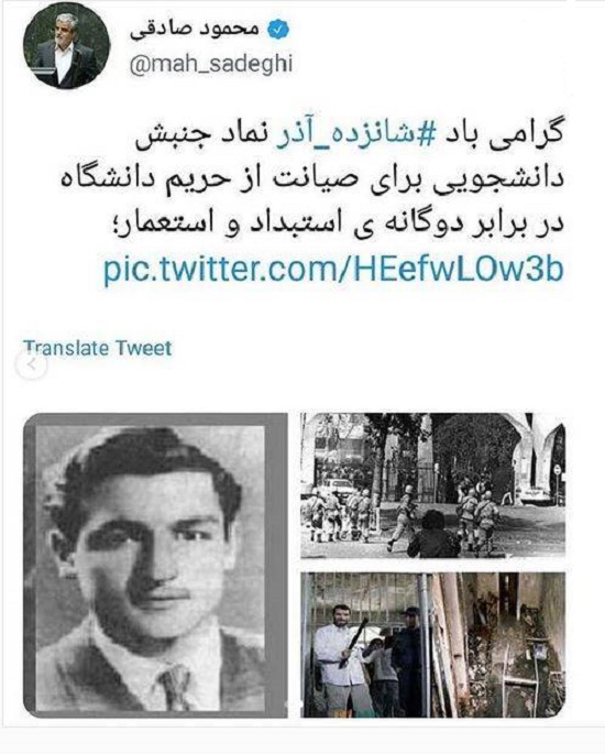 محمود صادقی در صفحه شخصی خود به مناسبت فرا رسیدن روز دانشجو، ۳ تصویر منتشر کرد و نوشت: «گرامی باد شانزده آذر نماد جنبش دانشجویی برای صیانت از حریم دانشگاه در برابر دوگانهی استبداد و استعمار» صادقی در این پست، عکس پشت صحنه فیلم اخراجیها را به عنوان نماد جنبش دانشجویی منتشر کرده است!