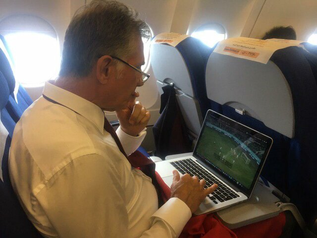 با پرواز هواپیما کیروش ترجیح داد کمی استراحت کند، اما با گذشت حدود ٣٠ دقیقه باز هم شروع به کار کرد. این بار لپتاپی رو پای خود گذاشت و به آنالیز و نوع قرارگیری بازیکنان خودش در زمین پرداخت.