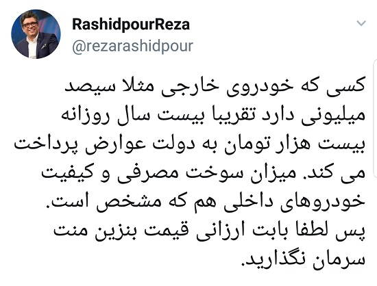 جامعه و فرهنگ » فرهنگ و هنر کد خبر: ۱۶۱۷۲۶ تاریخ انتشار: ۱۸:۴۰ - ۲۲ دی ۱۳۹۷ رشیدپور: بابت ارزانی بنزین، منت سرمان نگذارید رشیدپور در توییتر خود در رابطه با قیمت بنزین گفت: لطفا بابت ارزانی قیمت بنزین منت سرمان نگذارید. خبر های مرتبط کنایه رشیدپور به پولی شدن استفاده از تونلهای پایتخت +فیلم مالهکشی، ماموریت جدید «حالا خورشید»؟ تکذیب اظهارات مجری برنامه حالاخورشید توسط سازمان برنامه و بودجه چند نفر در کربلای ۵ شهید شدند؟ خبر های مرتبط کنایه رشیدپور به پولی شدن استفاده از تونلهای پایتخت +فیلم مالهکشی، ماموریت جدید «حالا خورشید»؟ تکذیب اظهارات مجری برنامه حالاخورشید توسط سازمان برنامه و بودجه چند نفر در کربلای ۵ شهید شدند؟