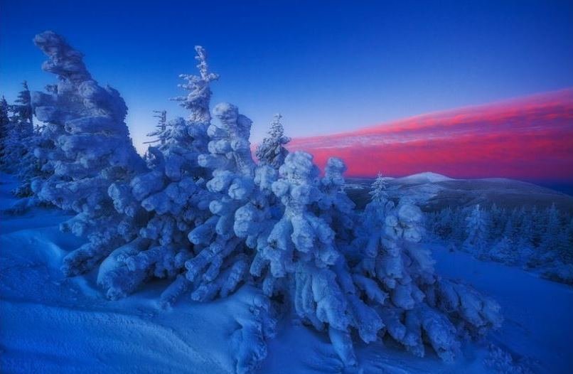 عکس امروز نشنال جئوگرافیک آسمان بامدادی دراماتیک همراه با درختان پوشیده از برف در دامنه رشته کوه کرکونوشه لهستان را نشان میدهد. این رشته کوهها در مرز جمهوری چک قرار دارند و مرز پارکهای ملی در هر دو کشور تعیین شدهاند.