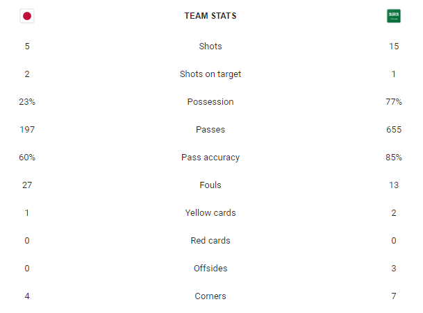 عربستان بازی را بهتر شروع کرد و در ۱۵ دقیقه ابتدایی بازی کاملا بر بازی مسلط بود و بازی بهتری ارائه داد تا اینکه روی یک کرنر تاکهیرو تومیاسو در دقیقه ۲۰ توانست با ضربه سر دروازه عربستان را باز کند.