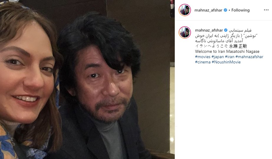 رویداد۲۴ مهناز افشار که این روزها مشغول بازی در فیلم سینمایی «نوشین» محصول مشترک سینمای ایران و ژاپن است، تصویری از خود و ماساتوشی ناگاسه را در اینستاگرام منتشر کرد و در توضیح آن نوشت: «فیلم سینمایی نوشین (بازیگر ژاپنی) به ایران خوش آمدید آقای ماساتوشی ناگاسه.»