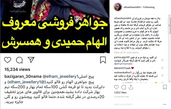 الهام حمیدی از انتشار یک ویدئو و نسبت دادن یک مغازه جواهر فروشی به او و همسرش عصبانی شده و از آن جواهر فروشی شکایت کرد.