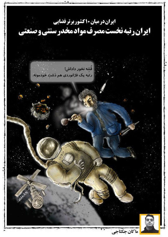 قرار گرفتن ایران در میان ده کشور دارای تکنولوژی فضایی از یک سو و قرار گرفتن در رتبه نخست مصرف مواد مخدر سنتی و صنعتی از سوی دیگر، سوژه انتشار کارتونی از ماکان جکتاچی در «نیش خط» شد.