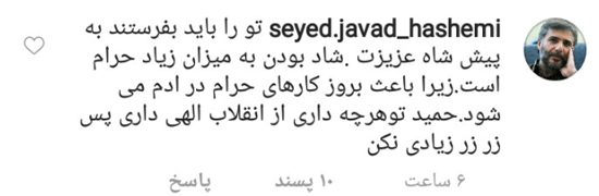 رویداد۲۴ در واکنش به این پست کاربران بسیاری به این بازیگر انتقاد کرده و برخی نیز از او حمایت کردند، اما در این میان کامنت سید جواد هاشمی به شکل غیر قابل باوری توهین آمیز است.