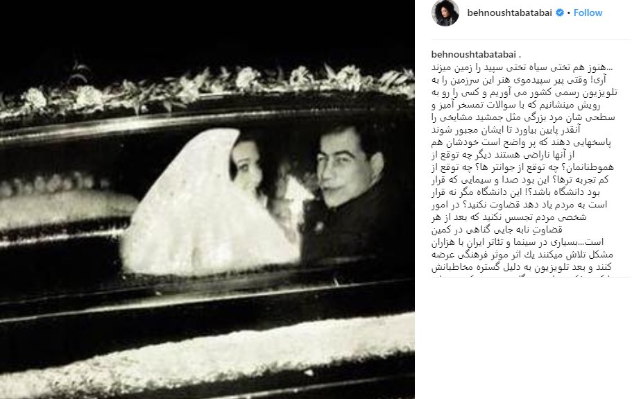 رویداد۲۴ بهنوش طباطبایی، بازیگر سینما و تئاتر که در فیلم سینمایی «غلامرضا تختی» به کارگردانی بهرام توکلی نیز به ایفای نقش پرداخته است، با انتقاد از نحوه گفتوگوی مجری برنامه «اختیاریه» با جمشید مشایخی در اینستاگرام نوشت: «هنوز هم تختی سیاه تختی سپید را زمین میزند... آری! وقتی پیر سپیدموی هنر این سرزمین را به تلویزیون رسمی کشور میآوریم و کسی را رو به رویش مینشانیم که با سوالات تمسخرآمیز و سطحیشان مرد بزرگی مثل جمشید مشایخی را آنقدر پایین بیاورد تا ایشان مجبور شوند پاسخهایی دهند که پرواضح است خودشان هم از آنها ناراضی هستند دیگر چه توقع از هموطنانمان؟ چه توقع از جوانترها؟ چه توقع از کم تجربهترها؟