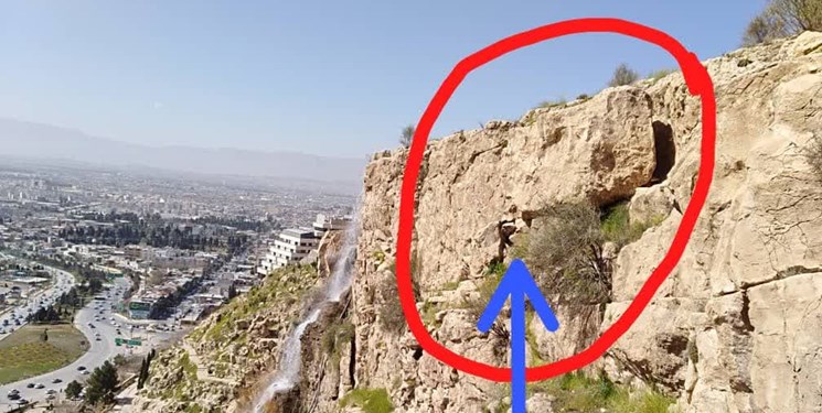 این تصویر گویای خطر ریزش قطعه سنگی جدا شده از کوه در ارتفاعات مجموعه خواجوی کرمانی است.