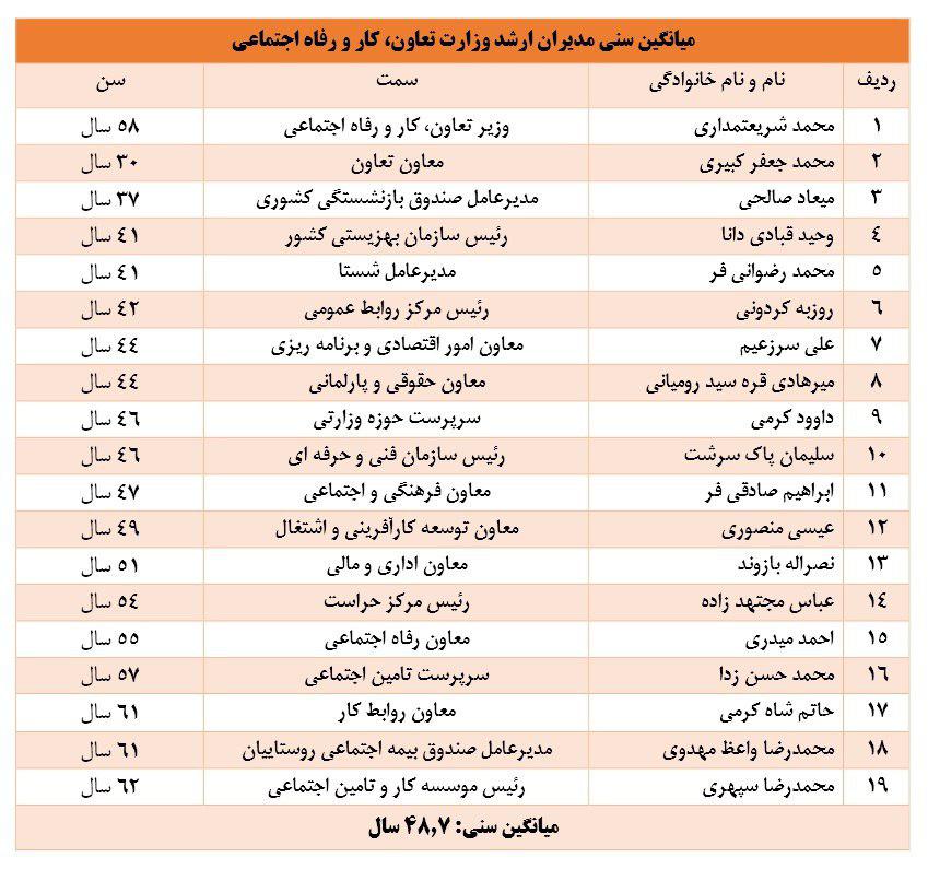 در کنار این ناامیدی مدیرانی هستند که این روزها تصمیم گرفته اند که عرصه را به جوانانی که در دهه سوم زندگی خود هستند، بسپارند. وزارت تعاون، کار و رفاه اقتصادی در همین شش ماه پیش با میانگین سنی ۵۷ سال عنوان " پیرترین" وزارتخانه اقتصادی را با خود به یدک میکشید، ولی اکنون این وزارتخانه با میانگین سنی ۴۸.۷ جوانترین وزارتخانه اقتصادی لقب گرفته است و میانگین سنی مدیران این وزارتخانه ۸.۳ سال کاهش پیدا کرده است.