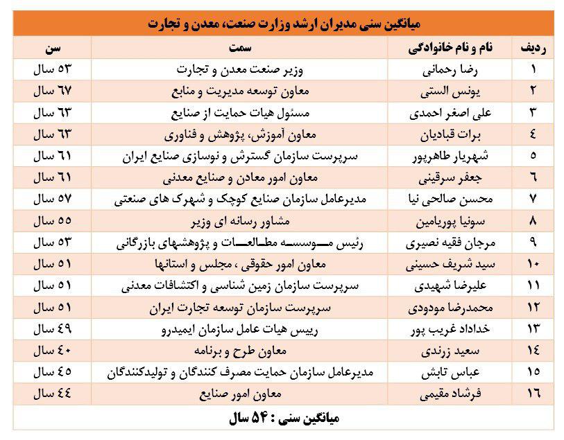 وزارت صنعت، معدن و تجارت نیز یکی از وزارتخانههای پیر است. در حال حاضر میانگین سنی مدیران این وزارتخانه ۵۴ سال است و رضا رحمانی که در جلسه رای اعتمادش وعده جوانگرایی داده بوده، وعده خودش را فراموش کرده است. جالب اینجاست بدانیم که میانگین سنی وزارتخانه صمت در زمان حضور رضا رحمانی نسبت به وزیر قبل بدتر شده است.
