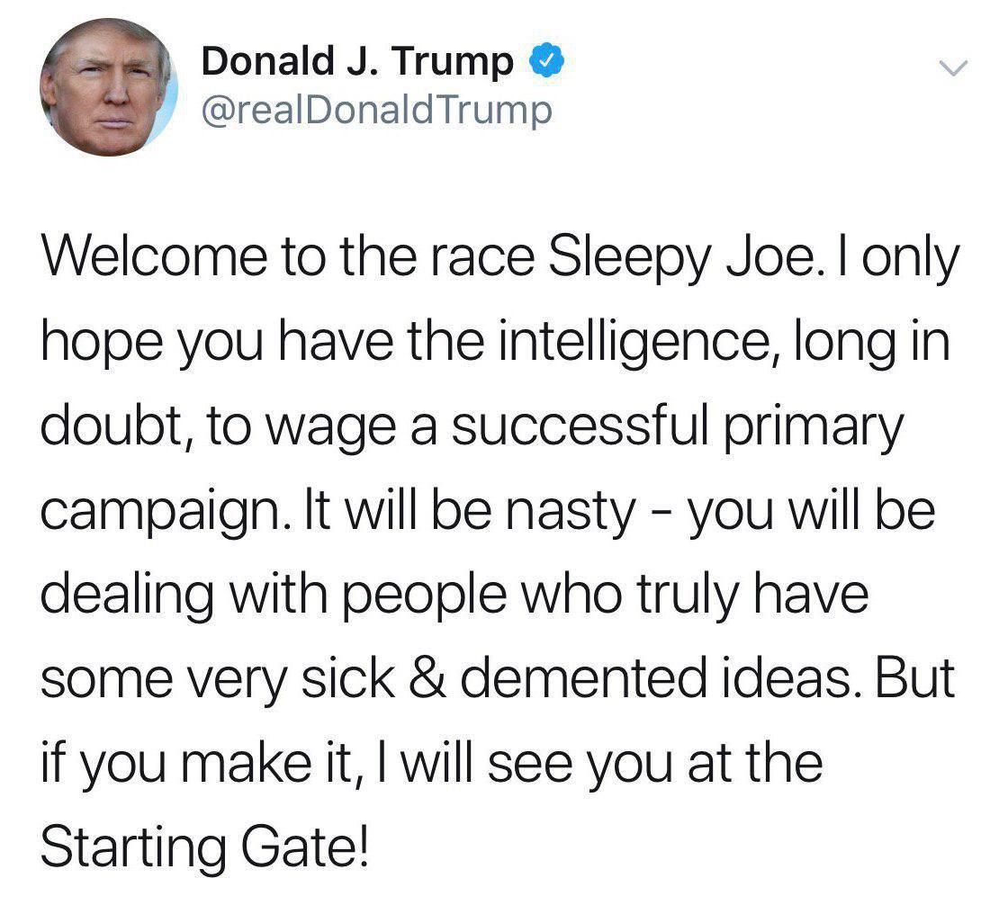 دونالد ترامپ در واکنش به ورود جو بایدن او را «بایدن خوابالو» خواند و نوشت: اگر هوش و حواس کافی داشته باشی، که البته شک وجود دارد، و در رقابت با دیگر کاندیداهای حزبت، که بعضی از آنها عقاید واقعا تهوع آوری دارند، پیروز شوی، من در آغاز رقابتهای سراسری خدمتت میرسم.