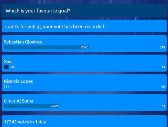 در این نظرسنجی یک روزه، ۱۷ هزار و ۳۴۲ نفر شرکت کردند که در نهایت گل سباستین جووینکو بازیکن الهلال به استقلال با ۵۹ درصد به عنوان بهترین گل انتخاب شد.