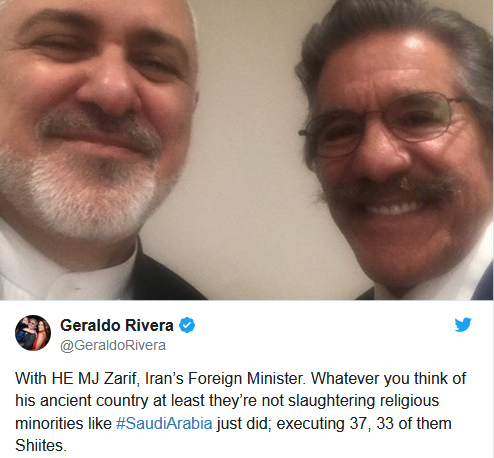 رویداد۲۴ "جرالدو ریورا" مجری معروف ۷۵ ساله آمریکایی تصویر یک سلفی با ظریف را در صفحه توییتر خود منتشر کرد و زیر آن نوشت: