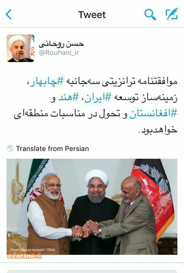 توییت روحانی و خبر از موافقتنامه ترانزیتی سه جانبه چابهار میان ایران و هند و افغانستان