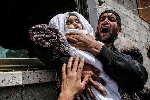 مراسم تشییع پیکر "صبا محمود ابو عرار" نونهال 14 ماهه فلسطینی که در حملات هوایی اسراییل به باریکه غزه به شهادت رسیده است. مادر صبا هم که باردار بود ساعاتی پس از حمله در اثر شدت جراحات به شهادت رسید.