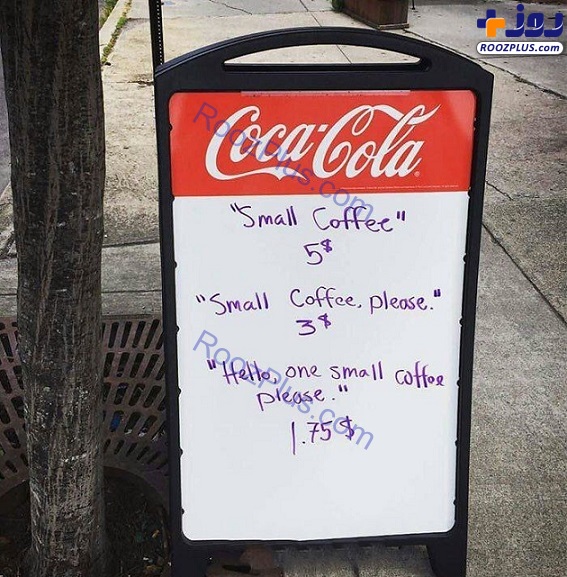 منوی متفاوت یک کافیشاپ در ویرجینیا برای تشویق مردم به صحبت کردن مودبانه را مشاهده میکنید. «قهوه کوچک»: ۵ دلار «لطفا یک قهوه کوچک»: ۳$ «سلام، لطفا یک قهوه کوچک»: ۱.۷۵$