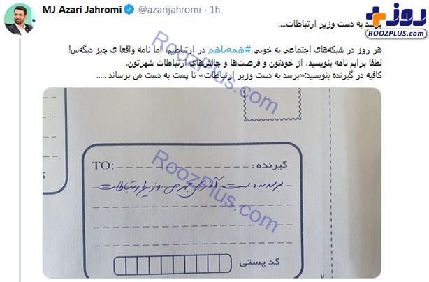 کافیه در گیرنده بنویسید: «برسد به دست وزیر ارتباطات» تا پست به دست من برساند ..»