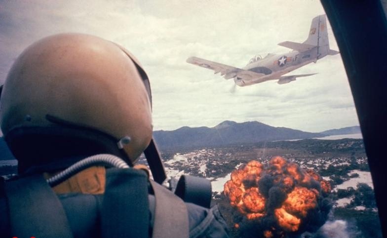 این تصویر یک جت آمریکایی را نشان میدهد که در اوایل جنگ ویتنام بمب ناپالم را روی پایگاه ویت کنگ انداخته است. این بمبها حاوی ژل چسبنده با قدرت اشتعال بالا بود که آمریکا در بمبها و شعلهافکنها استفاده کرد.