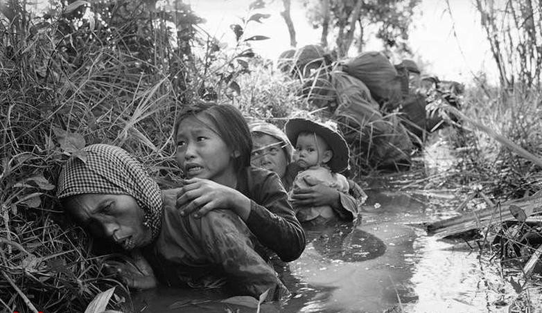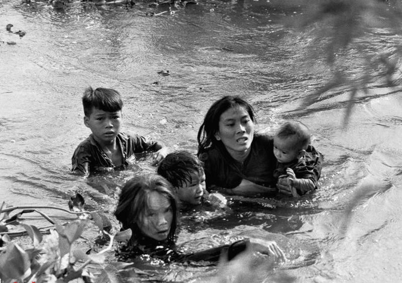 تنها سربازان نبودند که از شرایط جنگی در رنج بودند. خانوادهها مجبور بودند خانههای خود را ترک کنند. اغلب اوقات بدون کمک برادران، پدران و یا شوهرانشان که به جنگ فراخوانده شده بودند. این تصویر، یک مادر ویتنامی را نشان میدهد که با چهار کودک خود به سختی از رودخانه عبور میکند.
