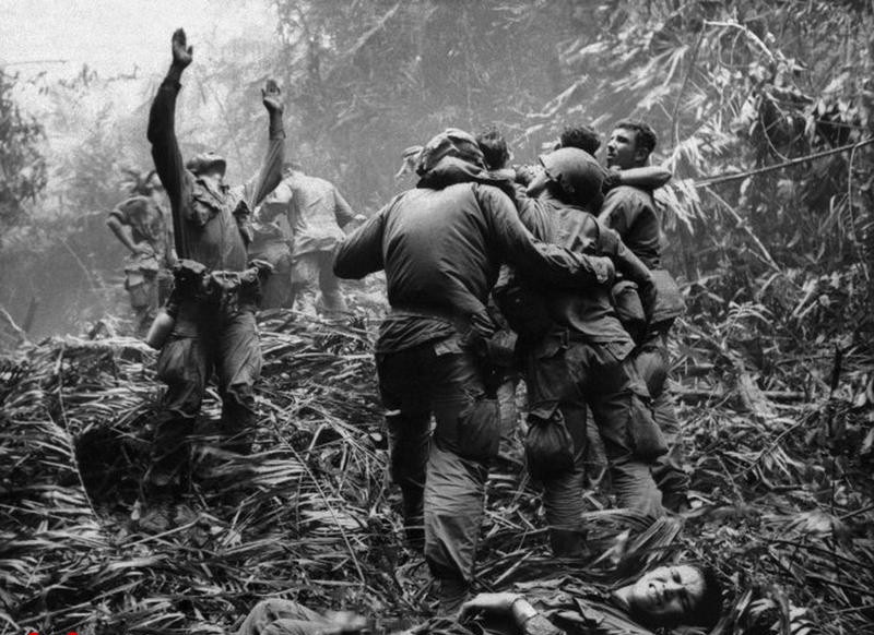 در این عکس، در حالی که یک گروهبان، هلیکوپترِ حامل کمکهای پزشکی که بار خود را تخلیه کرده، برای فرود در یک نقطه امن هدایت میکند؛ سربازان دیگر به افراد روی زمین افتاده در میان شاخ و برگهای درختان کمک میکنند. همان طور که در عکس مشهود است، بسیاری از سربازان مجروح، نومیدانه در انتظار کمکهای پزشکی هستند.