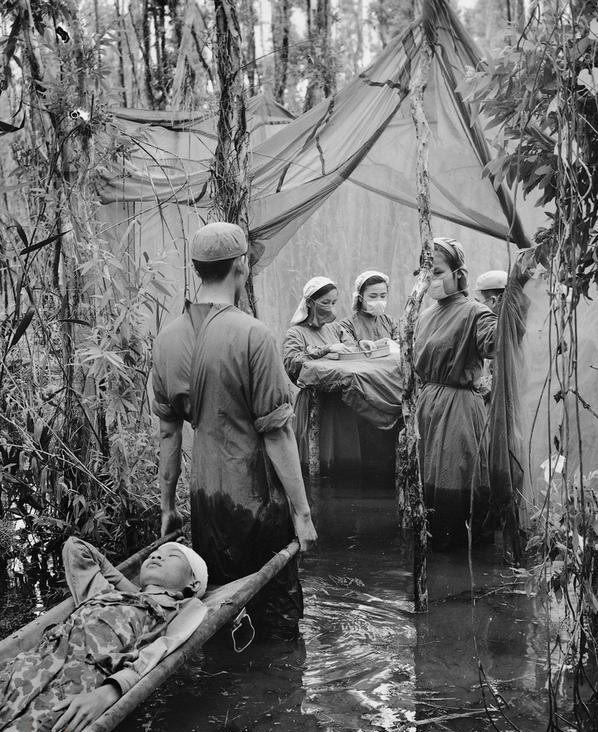 در خلال جنگ، هر جایی که ممکن بود، اتاق عمل برپا میشد. در این عکس، یکی از قربانیان بمبگذاری آمریکا، به اتاق عمل که در باتلاق حرا در شبه جزیره کامائو برپا شده، برده میشود.