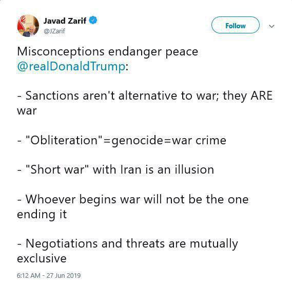 وزیر خارجه نوشت: جنگ کوتاه با ایران یک توهم است. هر کسی جنگ را آغاز کند پایان دهنده آن نخواهد بود.