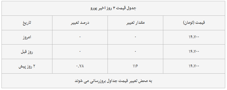یورو امروز بدون تغییر ۱۴،۷۰۰ (چهارده هزار و هفتصد) تومان معامله شد.