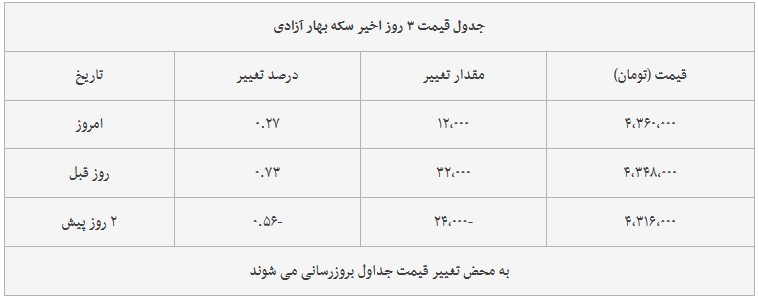 سکه بهار آزادی، امروز به ۴،۳۶۰،۰۰۰ (چهار میلیون و سیصد و شصت هزار) تومان رسید که نسبت به روز قبل، افزایش ۰.۲۷ درصدی داشته است.
