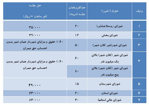 پرداخت حق جلسه به اعضای شورا بر اساس جدول زیر انجام میشود: