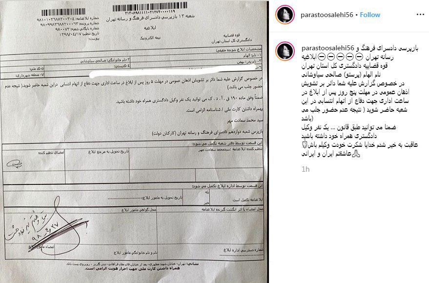 پرستو صالحی تصویری از احضاریهاش به دادگاه فرهنگ و رسانه را در صفحه شخصی خود منتشر کرد.