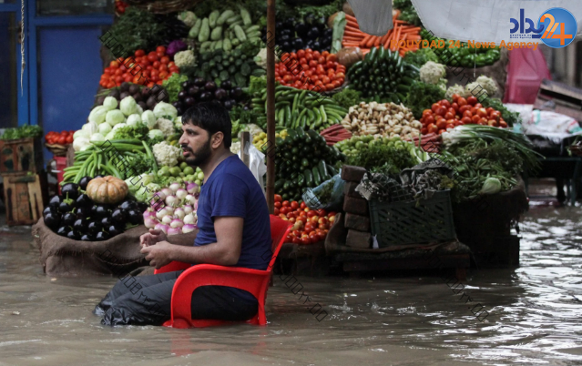 یک میوه فروش در انتظار مشتری در منطقه‌ای سیل زده، لاهور، پاکستان