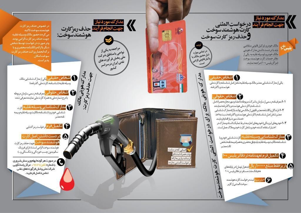 در دست داشتن اصل کارت هوشمند سوخت جهت حذف رمز کارت هوشمند سوخت الزامی است. (دارای فیزیک سالم بدون چسب خوردگی و شگستگی) در صورتیکه مالک خودروی عمومی کارت هوشمند سوخت شخصی ندارد و در خواست صدور المثنی داده است، کارت وی با اولویت در مرحله تولید، پاکت گذاری و توزیع است که با مراجعه به دفاتر پلیس + ۱۰ و تماس با مرکز پاسخگویی ۰۹۶۲۷ میتواند مطلع شوند.