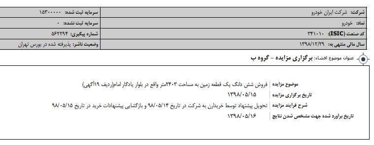 بر اساس انتشار تازهترین افشای اطلاعاتی ایران خودرو بر روی سایت کدال، این خودروساز بزرگ کشور، شش دانگ از یک قطعه زمین به مساحت دو هزار و ۴۰۰ متری در تهران را به حداقل قیمت پیشنهادی ۷۳ میلیارد تومان به مزایده گذاشته که نتیجه آن فردا مشخص میشود.