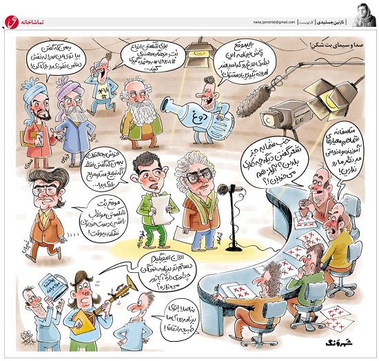 صفحه طنز و کارتون «شهرونگ» با انتشار کارتونی از نازنین جمشیدی به اظهار نظر یکی از مدیران صدا و سیما که گفته به شکستن بتهایی مثل احمد شاملو ادامه میدهیم، پرداخته است.