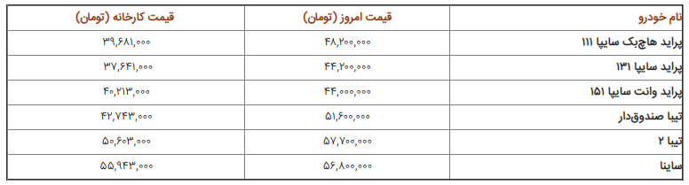 محصولات سایپا امروز طوری بی‌حرکت ایستاده‌اند که انگار نه انگار حدود ۹ میلیون تومان بالای قیمت مصوب کارخانه فروخته می‌شود. نمونه‌اش تیبا صندوق‌دار است که بدون تغییر نسبت به روز گذشته و با قیمت ۵۱ میلیون و ۶۰۰ هزار تومان در بازار فروخته می‌شود. کارخانه سایپا قیمت این محصول را در محاسباتش حدود ۴۲ میلیون و ۷۰۰ هزار تومان در نظر می‌گیرد. تیبا ۲ هم وضعیت قابل تعریفی ندارد. این خودرو حدود هفت میلیون بالاتر از قیمت مصوب کارخانه و حدود ۵۷ میلیون و ۷۰۰ هزار تومان در بازار فروخته می‌شود. ساینا کمترین اختلاف را با قیمت کارخانه دارد. سایپا می‌گوید این ماشین ۵۶ میلیون تومان است و فعالان بازار آن را ۵۷ میلیون و ۷۰۰ هزار تومان معامله می‌کنند.