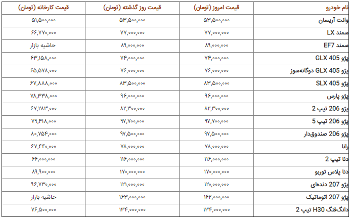 قیمت روز پژو پارس و رانا تغییری نسبت به روز گذشته ندارد. پژو پارس همچنان ۱۸ میلیون بالاتر از قیمت کارخانه و حدود ۹۶ میلیون در بازار فروخته می‌شود. رانا وضعیت مشابهی دارد و با اختلاف ۱۱ میلیونی نسبت به قیمت مسوب کارخانه، روی ۷۸ میلیون تومان ایستاده است.