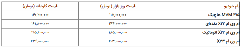 امروز خبری از کاهش قیمت انواع MVM از سری محصولات مدیران‌خودرو نیست. MVM ۳۱۵ هاچ‌بک بدون تغییر نسبت به روز گذشته باقی مانده و در بازار با قیمت ۱۱۵ میلیون تومان فروخته می‌شود. به طرز جالبی قیمت‌هایی که کارخانه مدیران خودرو برای محصولاتش در نظر می‌گیرد، بالاتر از قیمت کف بازار است. مثلا همین MVM ۳۱۵ هاچ‌بک در کارخانه ۱۴۰ میلیون تومان قیمت دارد. MVM X ۲۲ اتوماتیک در بازار ۱۸۵ میلیون تومان فروخته می‌شود، اما کارخانه روی رقم ۱۹۵ میلیون تومان اصرار می‌کند. اختلاف قیمت بازار و کارخانه برای MVM X ۲۲ دنده‌ای بیشتر است. طوری که می‌توان این ماشین را در بازار حدود ۱۴۴ میلیون تومان به صورت نقدی خرید، اما کارخانه آن را ۱۶۱ میلیون و ۸۰۰ هزار تومان می‌فروشد. این اختلاف قیمت در مورد MVM X ۳۳ به اوج خود می‌رسد. با اینکه فعالان بازار خودرو قیمت روز MVM X ۳۳ را ۲۰۳ میلیون تومان در نظر می‌گیرند، کارخانه قیمت این محصول را ۳۳ میلیون بالاتر یعنی ۲۳۶ میلیون تومان در نظر می‌گیرد.