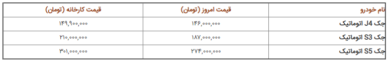 قیمت روز انواع جک از سری محصولات کرمان موتور امروز بدون تغییر نسبت به روز گذشته باقی مانده. طوری که جک J ۴ همچنان ۱۴۶ میلیون تومان و حدود چهار میلیون کمتر از قیمت مصوب کارخانه در بازار فروخته می‌شود. جک S ۳ امروز در بازار ۱۸۷ میلیون تومان است و جک S ۵ حدود ۲۷۴ میلیون تومان در بازار قیمت دارد. باید توجه داشته باشید که کارخانه کرمان‌موتور قیمت این ماشین را ۳۰۱ میلیون تومان در نظر می‌گیرد.