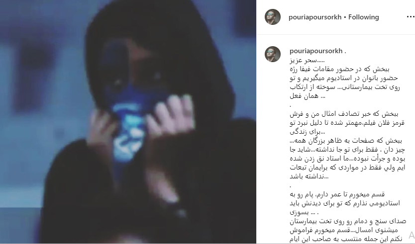 ببخش که در حضور مقامات فیفا رژه حضور بانوان در استادیوم میگیریم و تو روى تخت بیمارستانى... سوخته از ارتکاب همان فعل ...